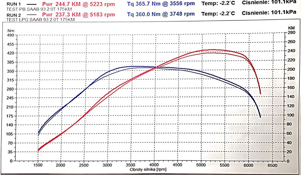 Tak więc SAAB generuje dzisiaj do 365Nm i 244KM – choć myślę że to minimalnie optymistyczny wynik, aczkolwiek realny przy temperaturze -2 stopnie, na lpg jest bliższy założeniom wynoszącym 350Nm 230KM. Jak widać dokładność logowania i tak jest na wysokim poziomie, a wykres całkiem ładny 🙂
