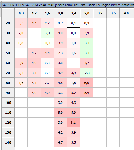 Otóż auto na benzynie miało tendencję do 'iścia’ lekko w plusowe korekty krótkoterminowe (co za tym idzie long term fuel trim także), tendencja sumarycznie, średnio około +3…+5%. Ale nie było to nic nadzwyczajnego, ot jak w każdym aucie – lekko w plus/lekko w minus, ideałów nie ma, w końcu po to są korekty.