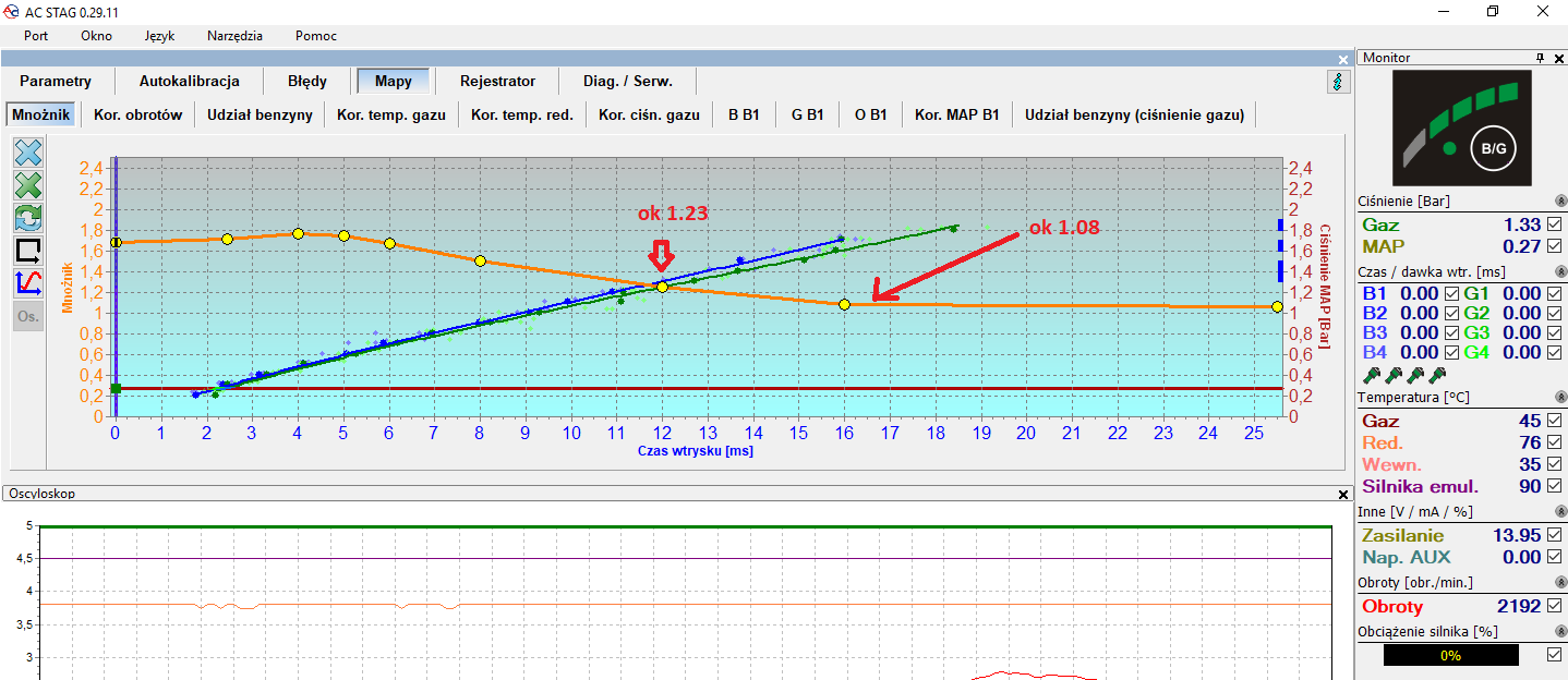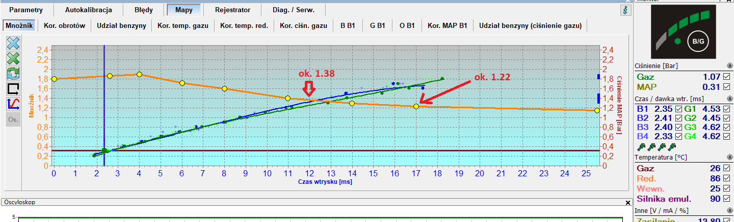 Na dowód dołączam screeny z ustawień instalacji LPG przed i po regulacji. Wystarczy porównać sobie wysokość punktów mnożnika i widać po tym że w zasadzie nie było to wystrojone. Okay rozumiem rozjazd rzędu 3, czy nawet 5% – z tym STFT/LTFT sobie poradzi, ale nie tyle… Swoją drogą powinny tu być zamontowane albo wydajniejsze wtryskiwacze albo ustawione wyższe ciśnienie LPG aby maksymalne czasy wtrysku były zbliżone.