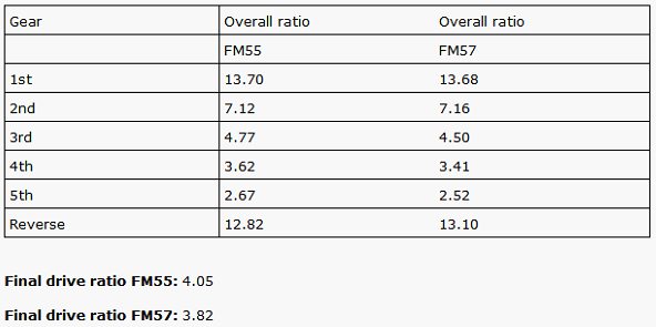 Poniżej mamy zestawienie wariantów FM55/57 i ich przełożeń wyciągnięte z WIS: