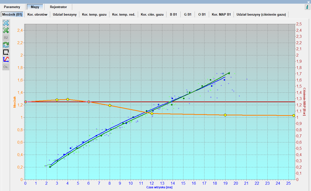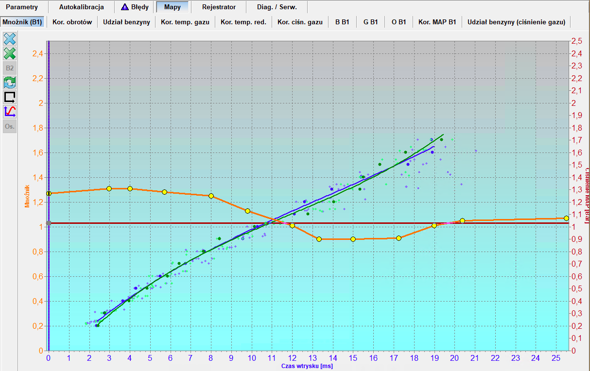 Czy taka krzywa mnożnika ma jakikolwiek sens? Mam tu na myśli czasy wtrysku przy (niemal) pełnym obciążeniu, w tym przypadku obszar od 13ms. To jest przecież jakaś komedia… Najwyraźniej ktoś patrzył na 'mapki’ i ich pokrycie, zamiast na sondę i korekty. Mapki są dla turystów… 😉 takie strojenie nie sprawdza się w jednostkach doładowanych, czy to turbiną czy kompresorem.
