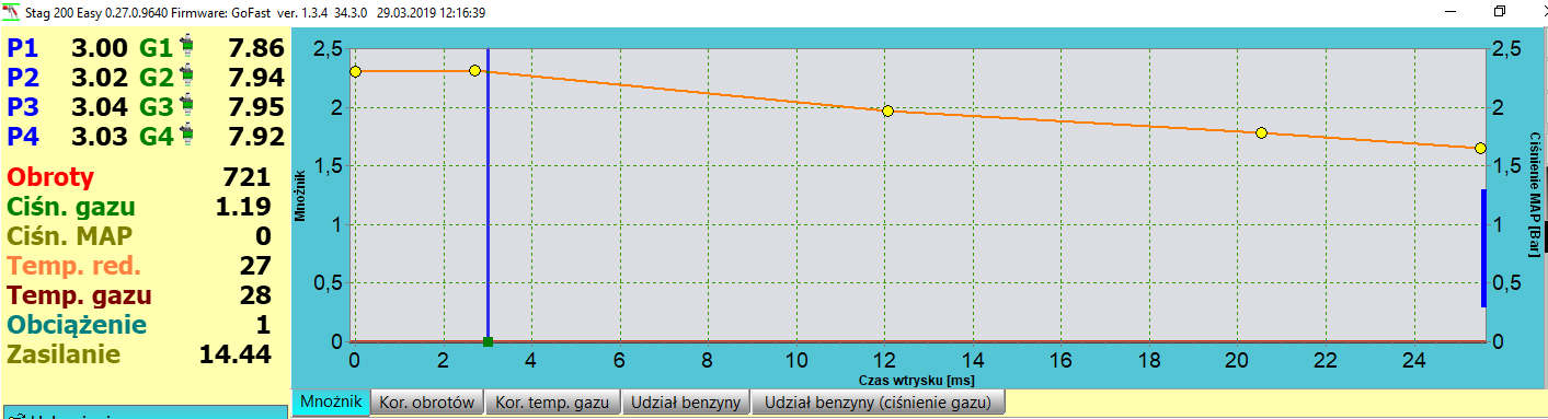 Silnik ustawiony jako 'valvetronik’, a więc taki bez/ze stałą wartością podciśnienia w kolektorze – technologia stosowana np. w BMW. Mnożnik to jakaś porażka – komuś 'tak wyszło’, 'na pałę’, jego wysokość po części wynikała z zastosowanych dysz – nie chciało się rozwiercić? (czasy wtrysku na wolnych obrotach 2-krotnie dłuższe dla wtrysków lpg niż dla benzyny), wtryski AC W01BFC, więc bardzo wydajne.