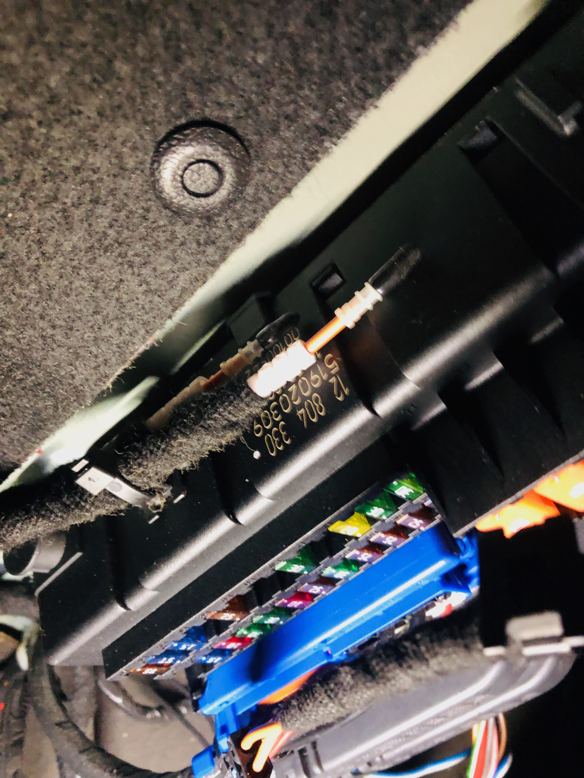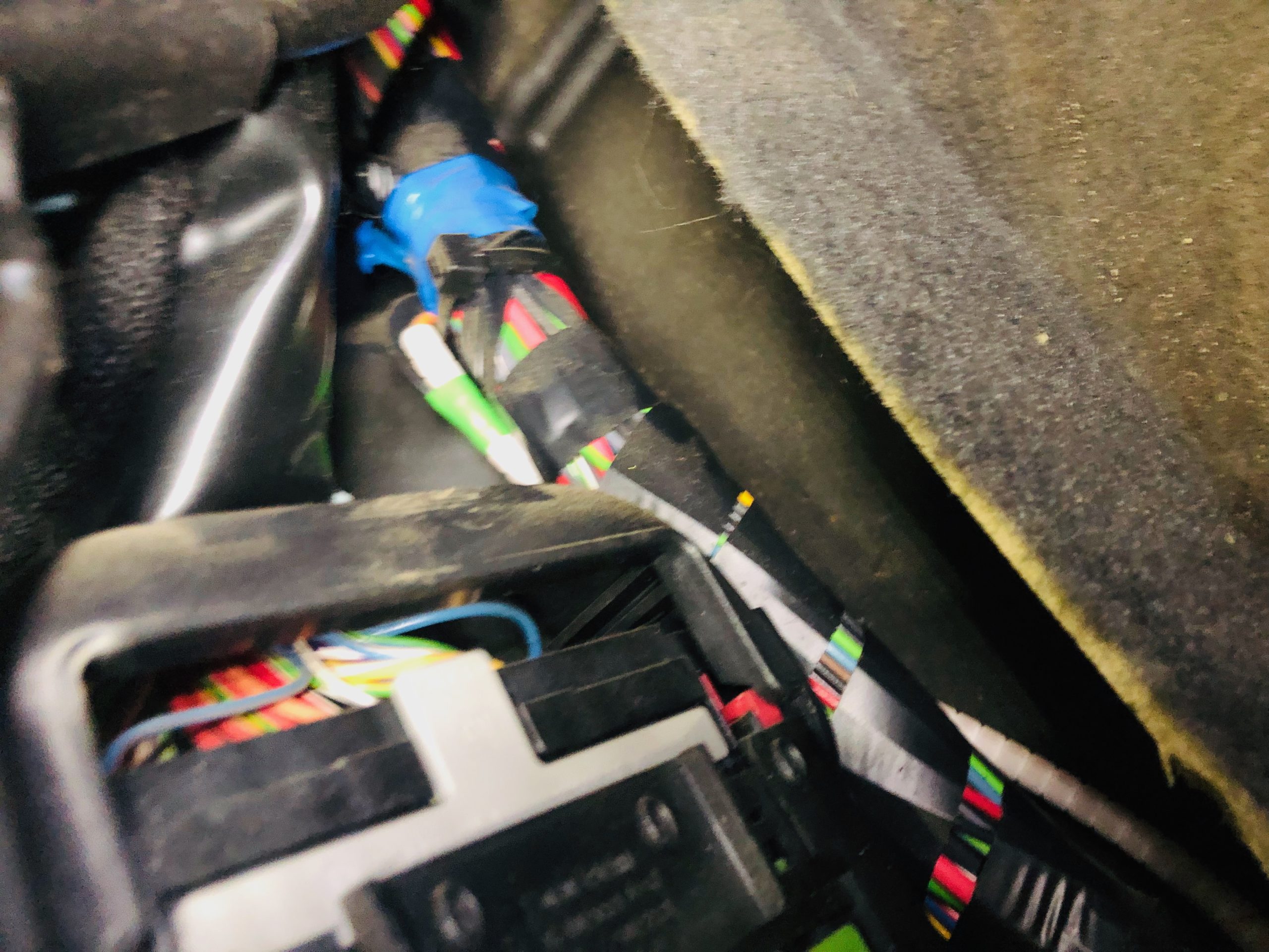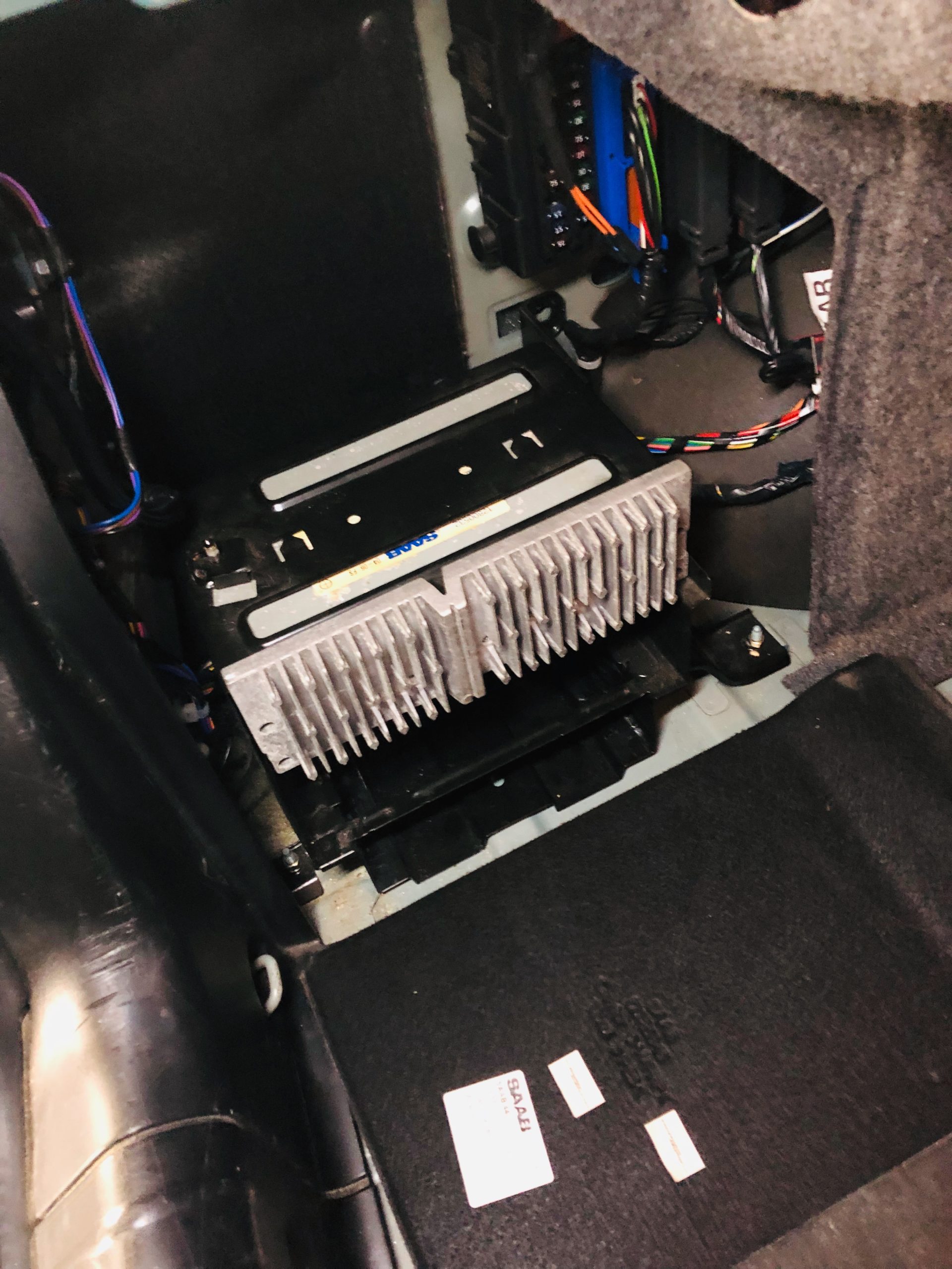 - odkręcamy fotel kierowcy (TX 45 czy 50mm – nie pamiętam) i odkręcamy/odpinamy wzmacniacz AMP1, podnosimy wykładzinę, tam także powinien być dodatkowy światłowód, również schowany w taśmie, idący od tyłu auta