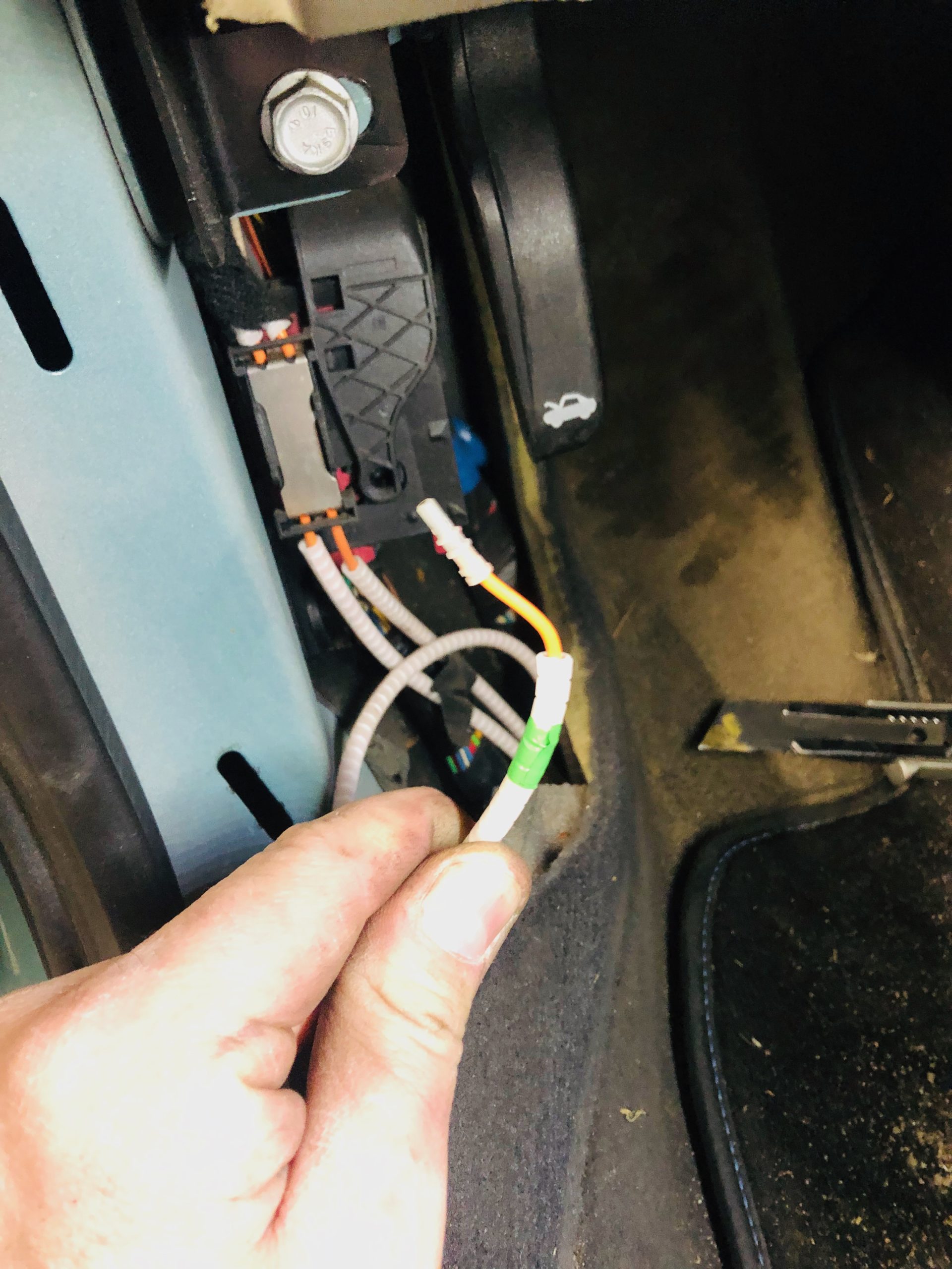 - zdejmujemy plastikową osłonę przy podstopnicy/dźwigni otwierania maski. Tam powinien być ukryty dodatkowy 'ślepy’ światłowód – jest trochę głębiej, po lewej stronie, końcówka schowana w zwykle niebieskiej izolacji
