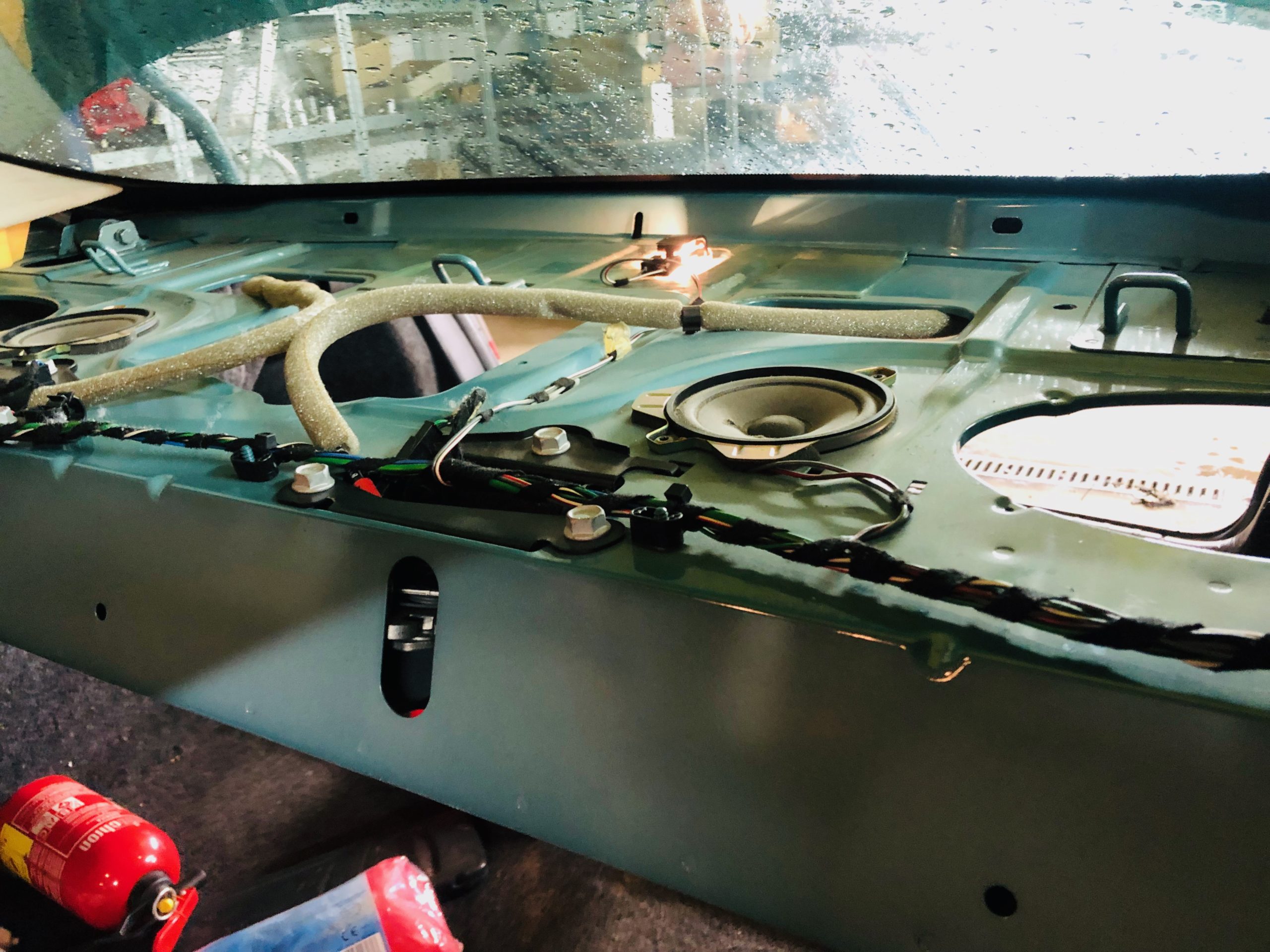 - wiązkę od REC poprzez lewy tylny słupek C do półki z 4 (tak, czterema) kostkami zasilającymi głośniki