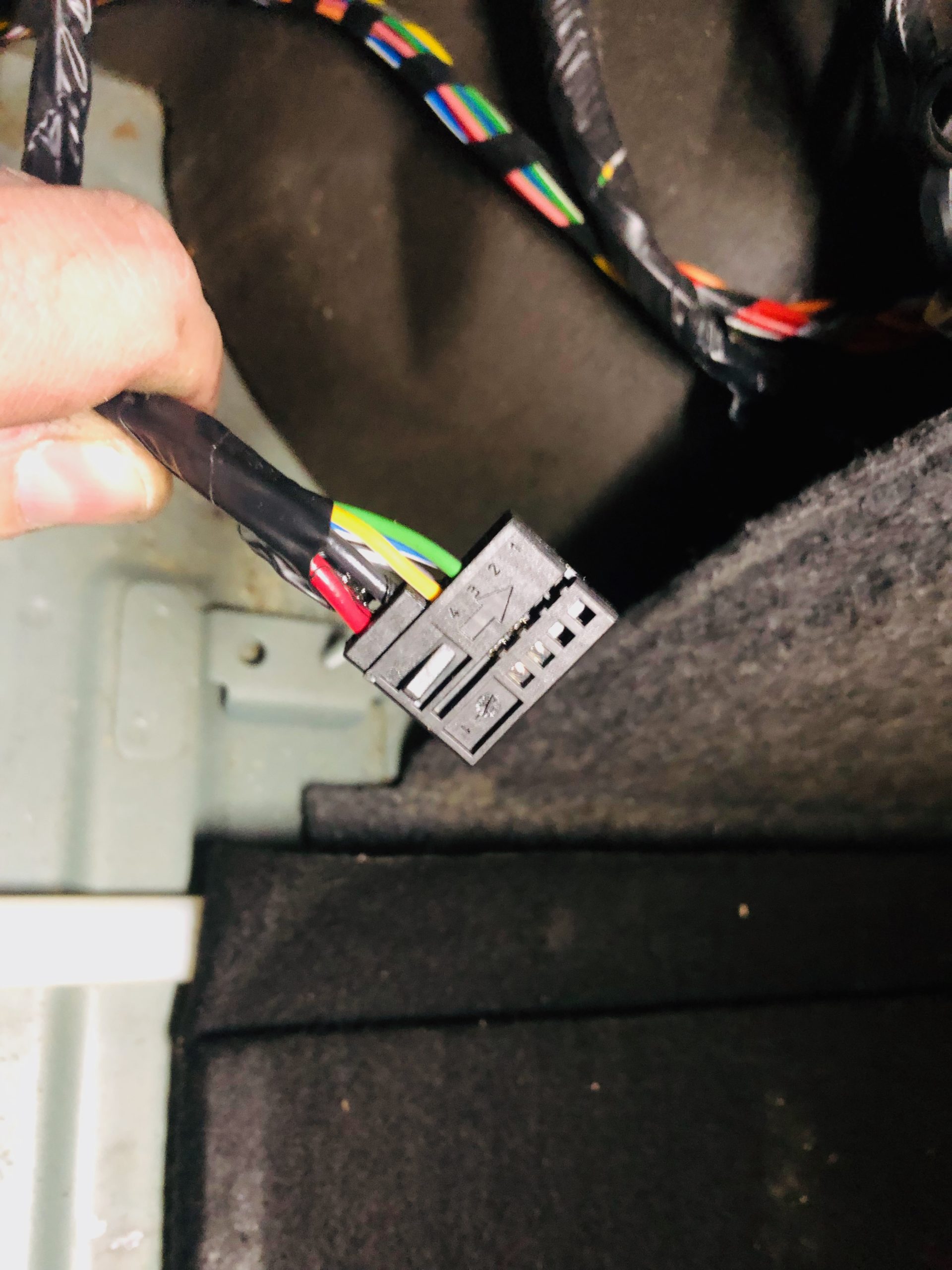 - wiązka która zasila głośniki idzie dalej w kierunku słupka C lewy tył, gdzie mamy do odpięcia dwie kostki 'szarą’ i 'czarną’ i idzie dalej w kierunku modułu REC, do którego jest wpięta szeroką kostką.